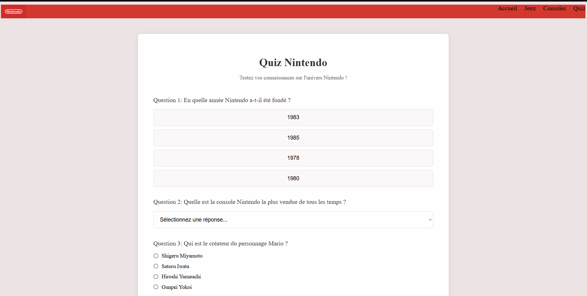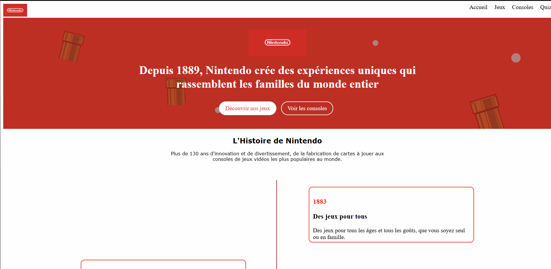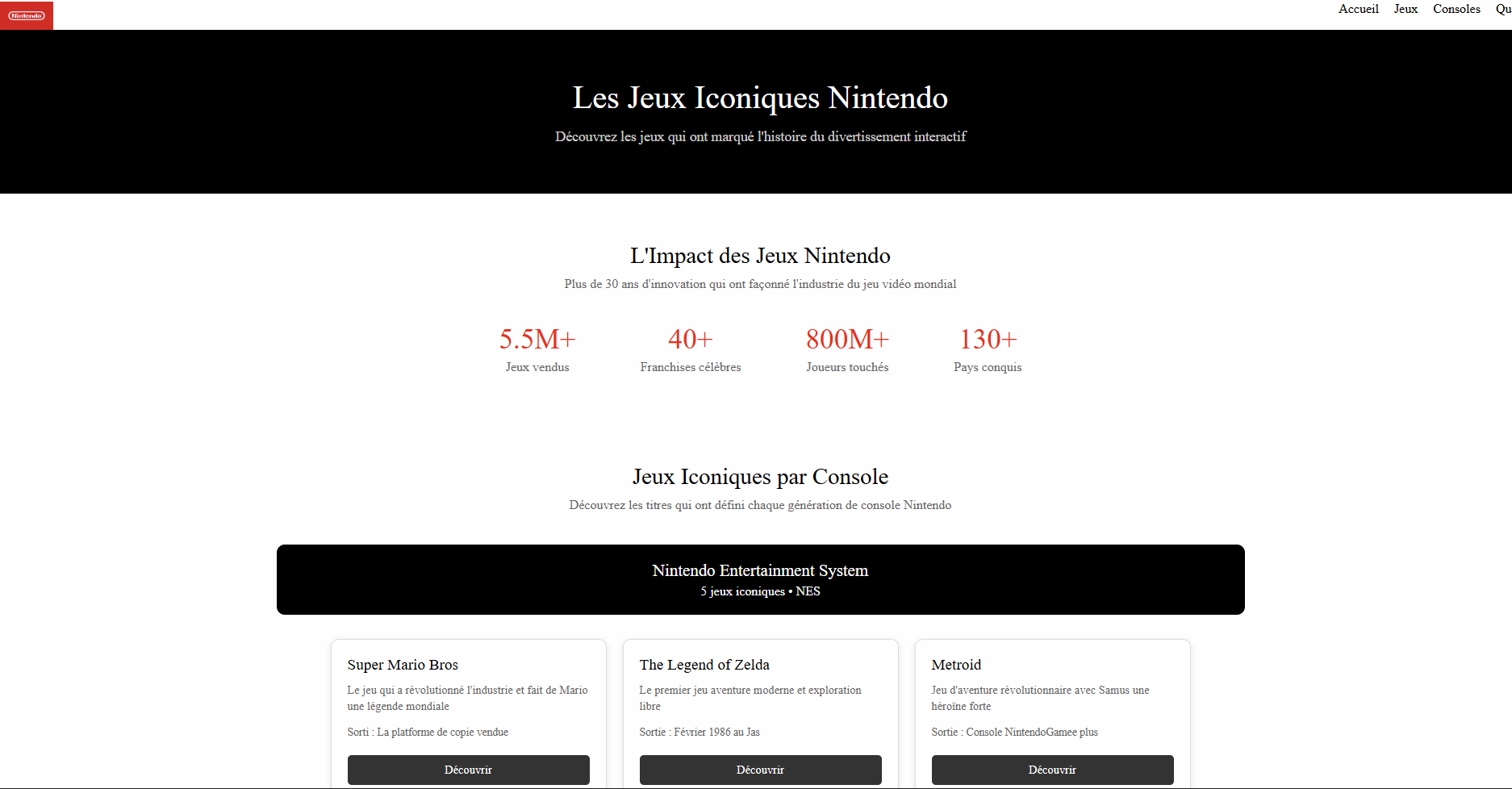 Dans le cadre de cette AP, j’ai réalisé un site vitrine pour la société Nintendo afin de démontrer mes compétences en développement web. J’ai commencé par créer les maquettes de mes différentes pages sur Figma, en définissant une charte graphique cohérente et en veillant à l’harmonie du site. Une fois les maquettes validées, je les ai intégrées en HTML et CSS.